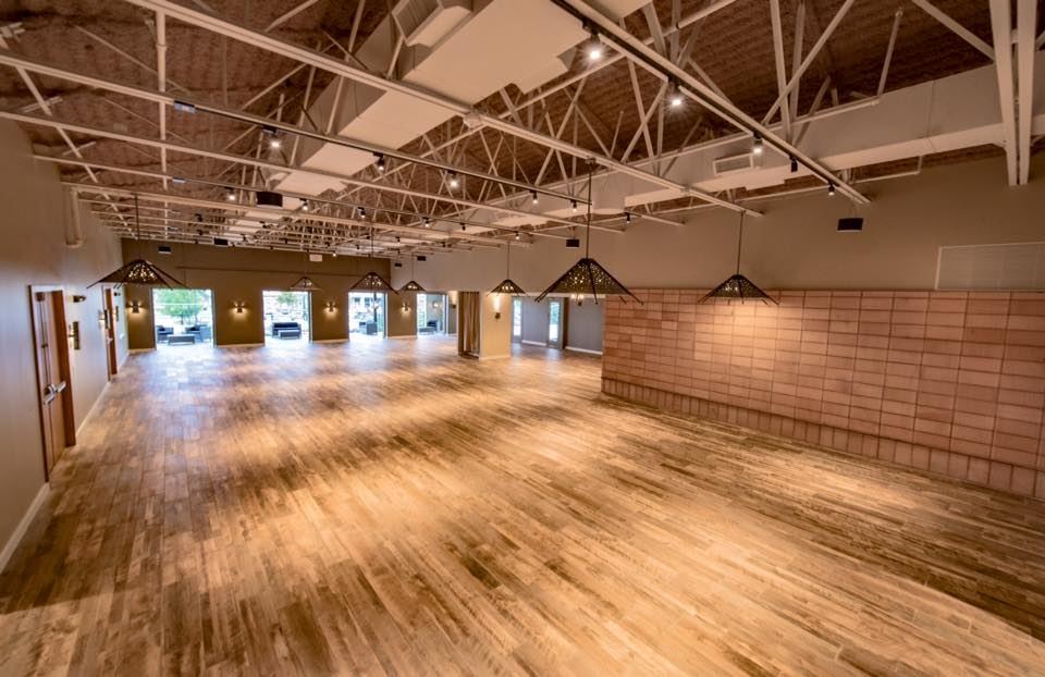 Modern loft space overlooking downtown Fort Worth. The three hundred seat main room defines the center. Exposed steel trusses, large sliding custom made ‘barn doors’, hand-hewn large chandeliers and sconces, terracotta brick, and wood tile floor contribute to the loft experience.