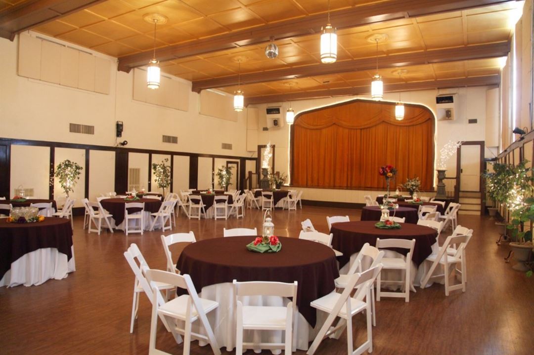 Built in 1955, the chapel provides seating for 125 guests. During daylight hours, the room is suffused with light from stained glass windows that repeat the rose motif in the original circular window set above the entrance. Chandeliers suspended over the carpeted center aisle, and lights above the arched colonnades on each side of the chapel provide light for evening and night weddings. Candelabras, a large floral arrangement, and tulle pew-bows make additional decorating unnecessary in this beautiful room. The vaulted, beamed ceiling provides wonderful acoustics for live or recorded music.