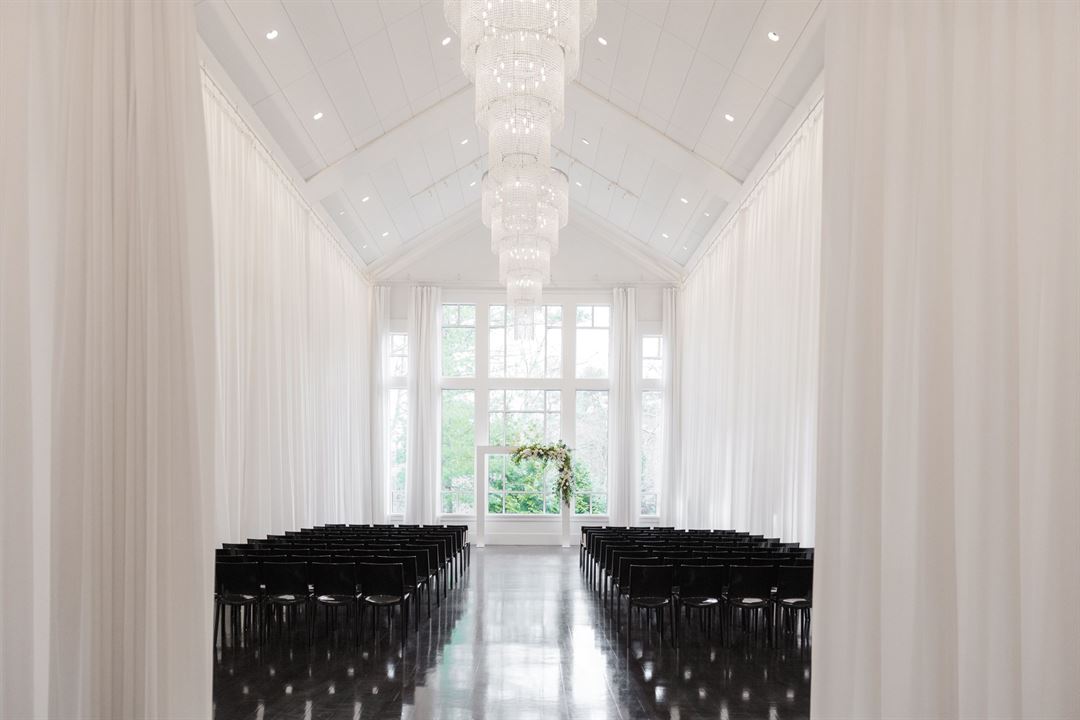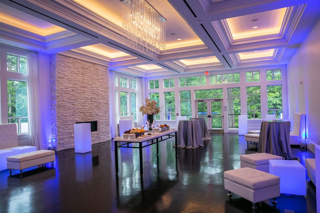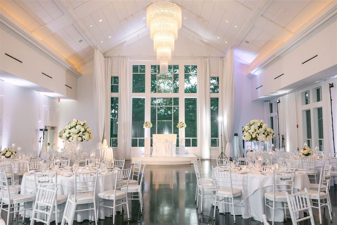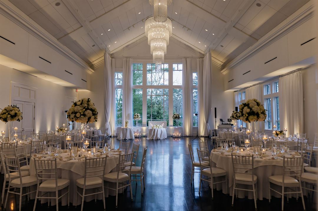 Strikingly modern flair meets natural beauty with all-white decor, dramatic windows and picturesque water views. Ample space for dancing is showcased by cathedral ceilings with contemporary crystal chandeliers and sleek, polished flooring. Flowing white curtains lead to a separate cocktail area, featuring white leather lounge furniture. The private deck and terrace area overlook the lake that's surrounded by towering pines. Say “I do” in a beautiful outdoor quintessential New England setting or beneath soaring majestic ceilings against a backdrop of magnificent windows with serene woodland views.