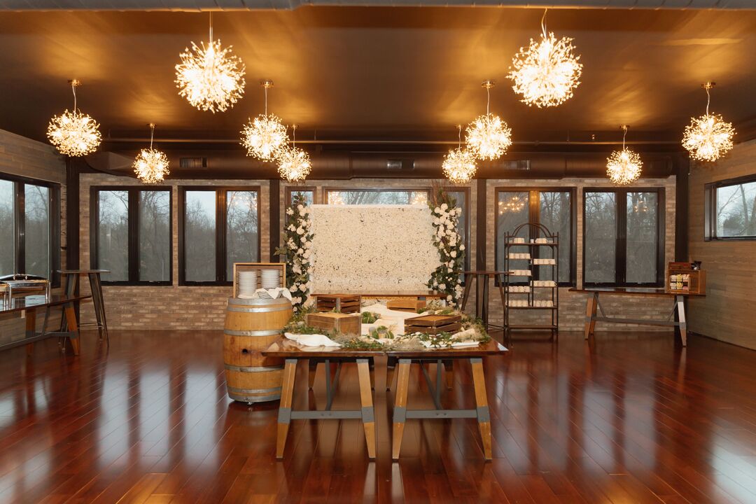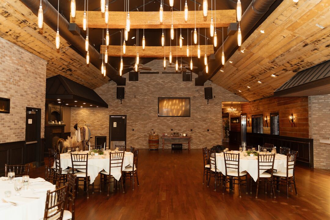 The updated room features rich hardwood finishes, exposed brick accents, thoughtfully designed lighting, and refined architectural details that add warmth and character without sacrificing a modern aesthetic. The result is an inviting environment that feels intimate yet impressive, ideal for couples seeking a venue that stands apart from the expected.