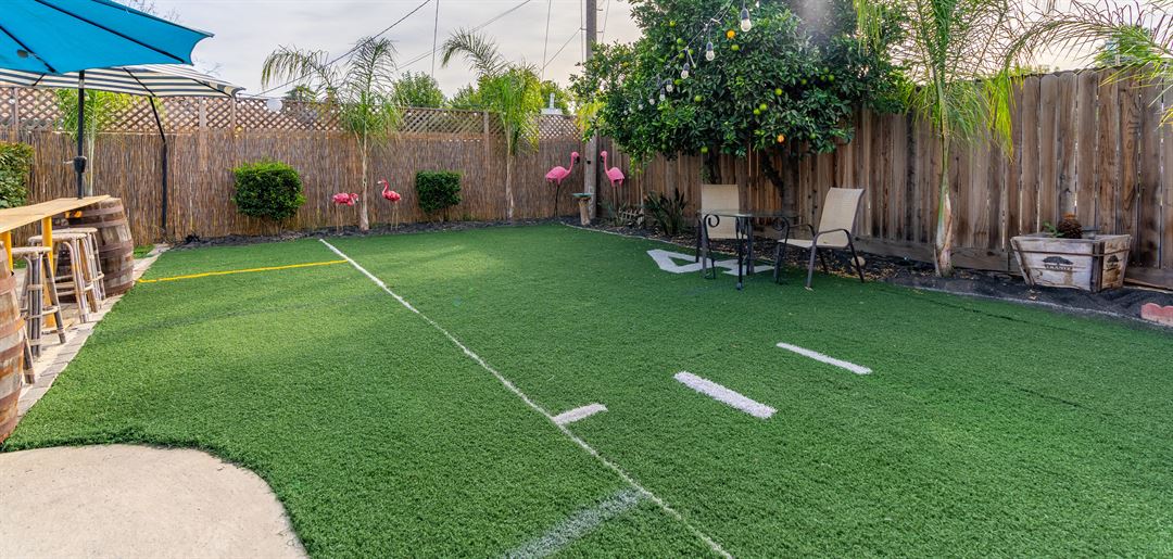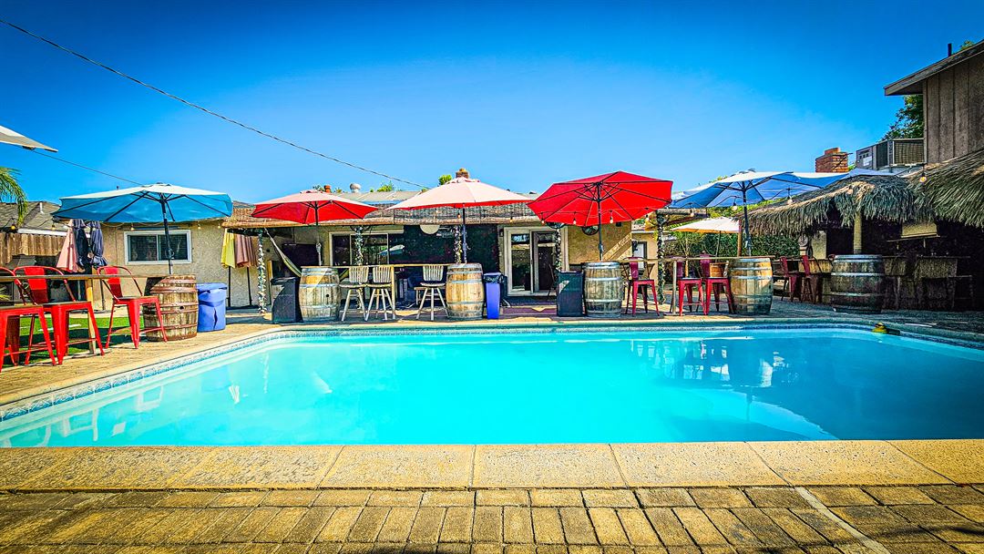 This property has a patio, bar, 2 bathrooms, two outdoor lounges, grill, chimney, 3 smart TVs and one 120" screen, swimming pool, outdoor shower, two loungers, outdoor heaters, fans, insulated patio cover, plenty of shade and seating area.