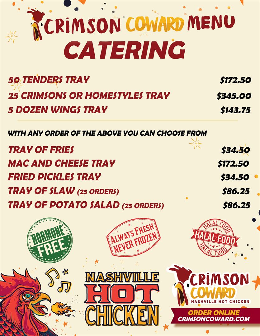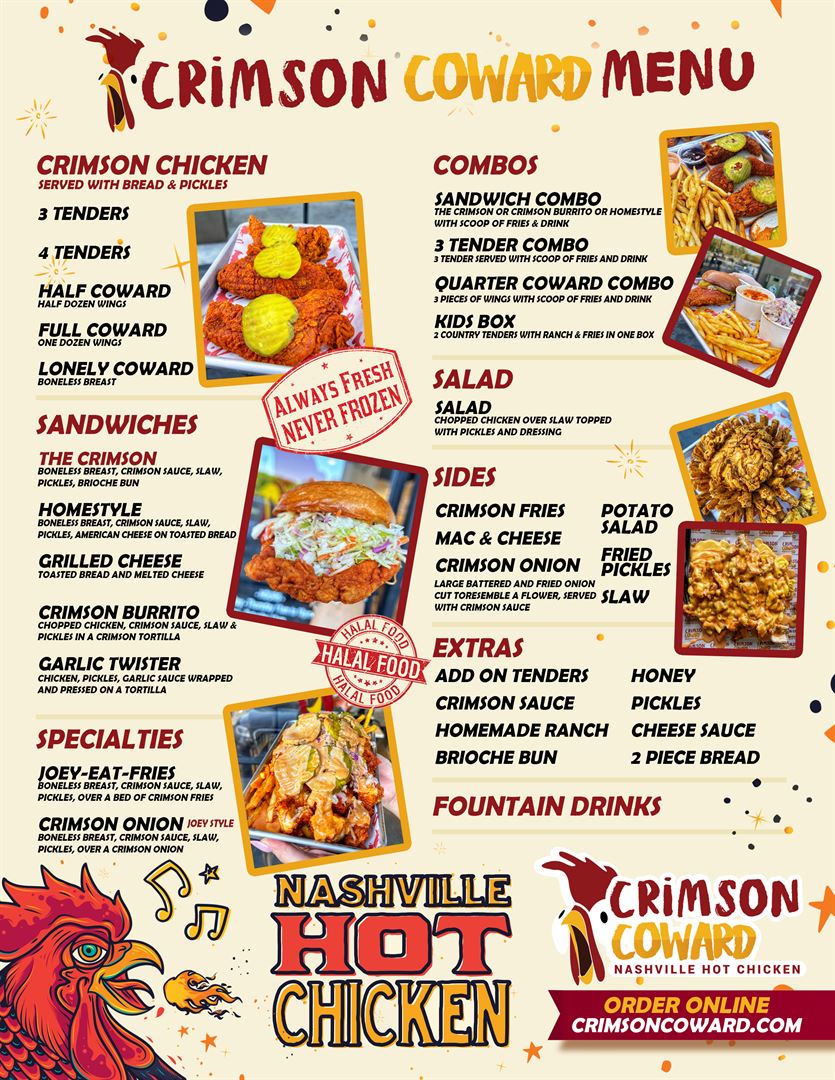 Best Nashville Hot Chicken in Frisco, TX and surrounding areas. Crimson Coward commit to bringing the Nashville Hot Chicken phenomenon to the masses. Our time meeting real Nashville chefs and exploring the most incredible eateries and hot chicken joints in Nashville was inspiring. We dedicate our expertise to producing great quality and excellent food. Here at Crimson Coward, we pride ourselves on serving Nashville hot chicken that does not compromise quality or flavor. Our food redefines quality by using only the freshest ingredients, including signature sides made fresh daily. We only serve premium, all-natural, Non-GMO chicken free of hormones and antibiotics. We source from some of the most reputable farms. We are proudly 100% Halal.