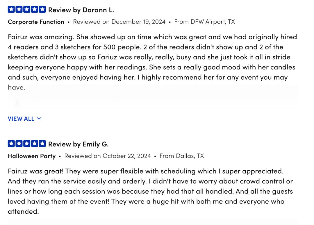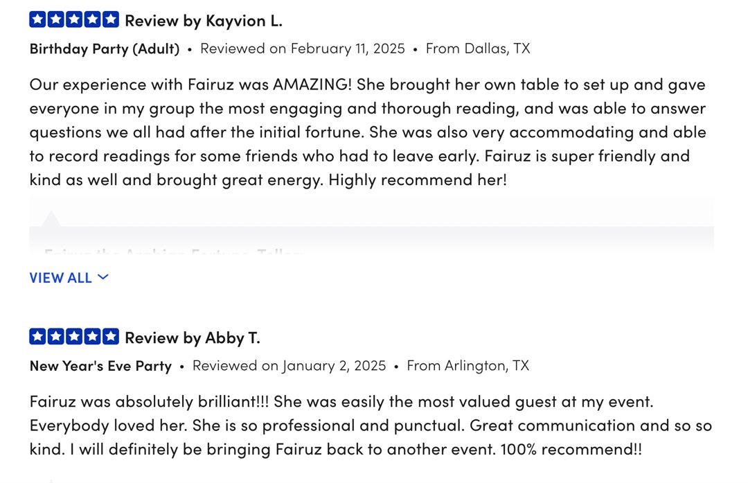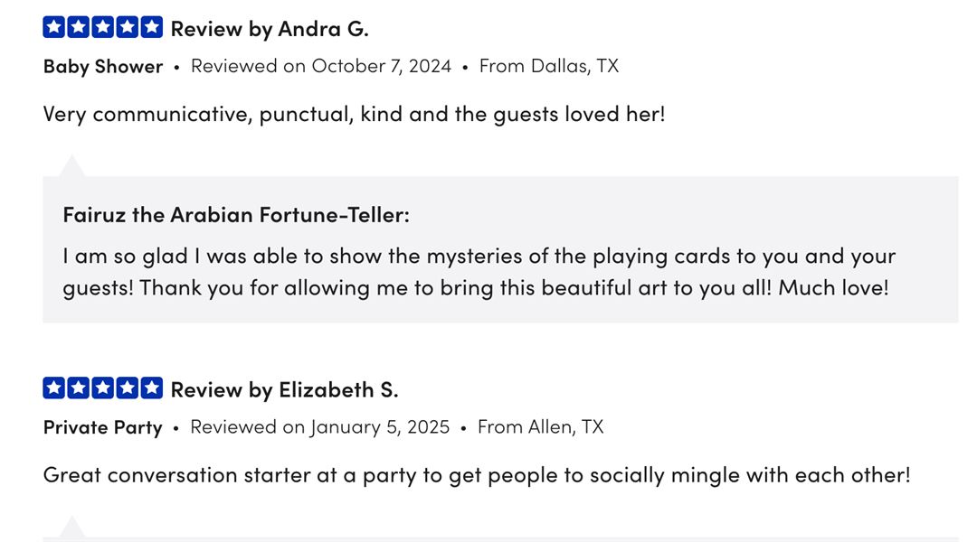Perfect for all event types, I promise to elevate your gathering with an exotic psychic flair that leaves your guests speaking of your gathering for days after.