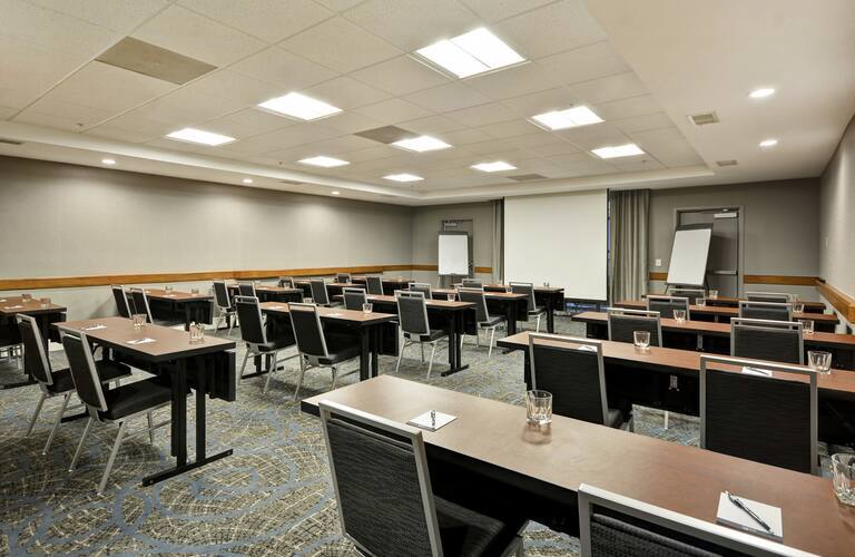 We have an 884 sq. ft. event space on the first floor of our hotel, next to the lobby and bathrooms. This space has a private patio overlooking our courtyard with outdoor furniture. The event space, called The Gallery, has complimentary HSIA, adjustable air conditioning, a 7x10 ft. drop down screen, and a large granite top buffet cabinet in the back of the space.