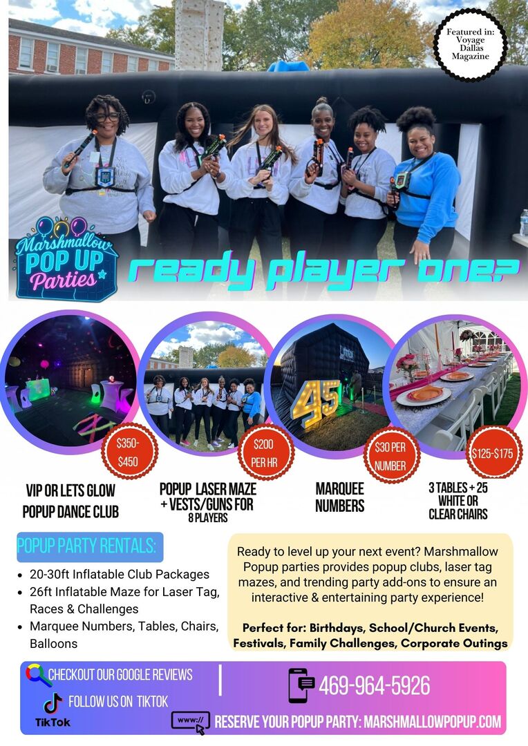 Pop, Lock & Party in an Inflatable Nightclub! Marshmallow Popup Parties, located in Frisco, TX provides a unique and affordable party experience for any special occasion. Planning a birthday celebration, corporate outing, neon party or sweet 16? We provide a Popup club with all of the elements of a small venue with professional lighting, sound & a VIP entrance.