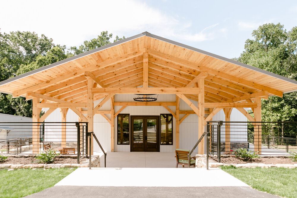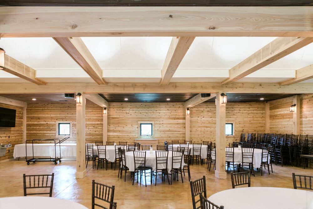 The barn sits on 27 acres and overlooks an acre pond, just outside of Gainesville GA. It’s 3000 square feet of climate controlled, tongue and groove cedar, with old rusted tin roof ceiling. The ceremony spot overlooks an acre pond that has a fountain in it and a gorgeous backdrop of trees. Depending on the season the leaves on the trees could be a brilliant green or different variations of vibrant reds, oranges, and yellows. Through whatever season though there is sure to be a stunning backdrop no matter what! We use white folding chairs to accommodate your guest size.