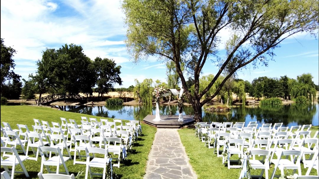 A tranquil setting, nestled upon seventeen secluded acres of beautiful open farmland. Bridgewood Events is bordered by scenic vineyards and lovely almond orchards. The focal point of the venue is a breathtaking pond surrounded by mature trees and plush green lawns, highlighted by a picturesque arched wooden bridge. Offering a rustic 4380 square foot barn that proudly boasts an americana painting of the American flag waving gently on a breeze. The barn displays open beams with dimmable bistro lighting. Your guests will also adore the scenic views of the waterfront ceremony area. This intimate setting is perfect for an elegant country wedding, reception, family reunion or celebration of life. Even though we are conveniently found just a couple of miles off Highway 99 and ten minutes from I-5, at Bridgewood you’ll feel like you’re many miles away- situated on a quiet, dead end country road. Our mission is to provide you with a stunning backdrop for your event that will wow your friends and family and create amazing memories that will last a lifetime.