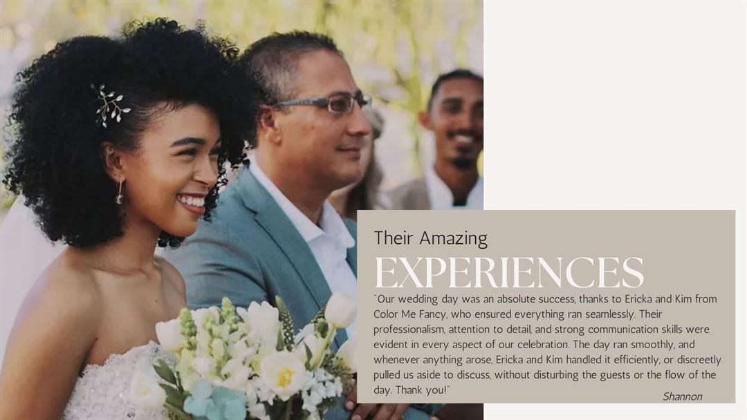 Welcome to Color Me Fancy Events, where wedding dreams come true — no stress, no chaos, just the perfect wedding day! With 10 years of experience in turning "I do" into "We did it perfectly," Our team adds a personal touch to every detail, ensuring your big day is as unforgettable as your love story.