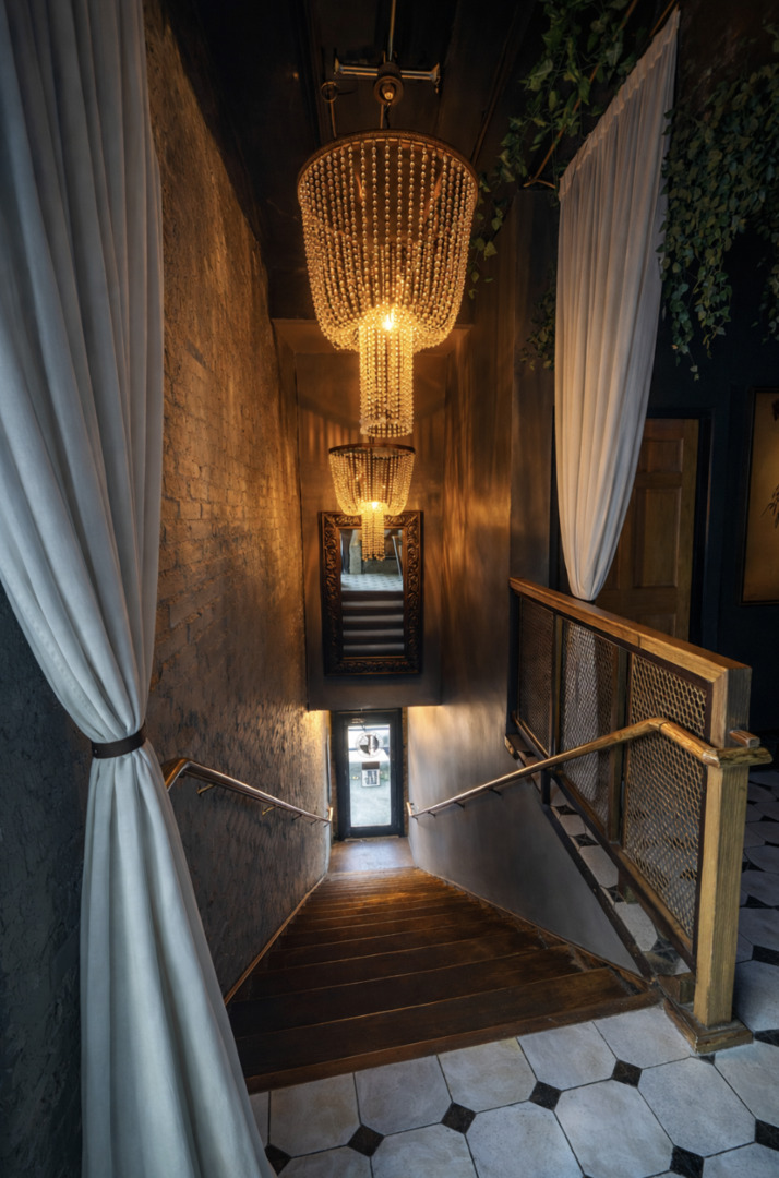 Loft-style speakeasy cocktail bar located above State Street in Geneva, ideal for private events such as birthdays, bridal and baby showers, rehearsal dinners, and networking mixers. The space features a flexible open layout, full-service bar, and an upscale, moody atmosphere with chandeliers, greenery, and floral accents. Elevated, chef-crafted food options are available and can be tailored to your event.