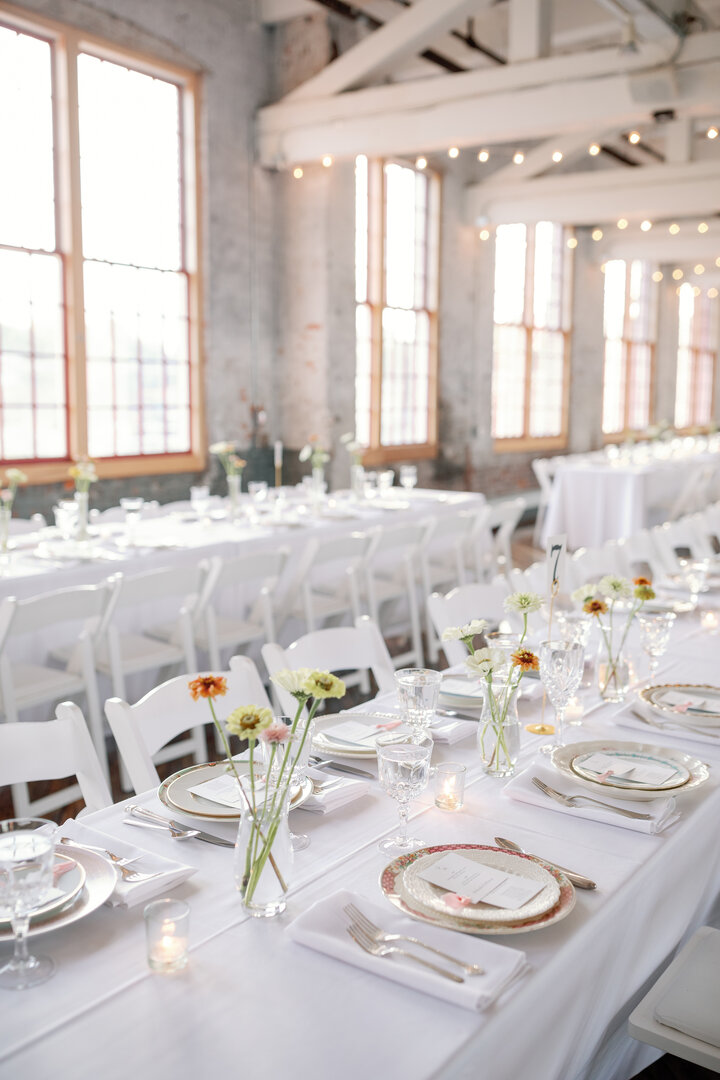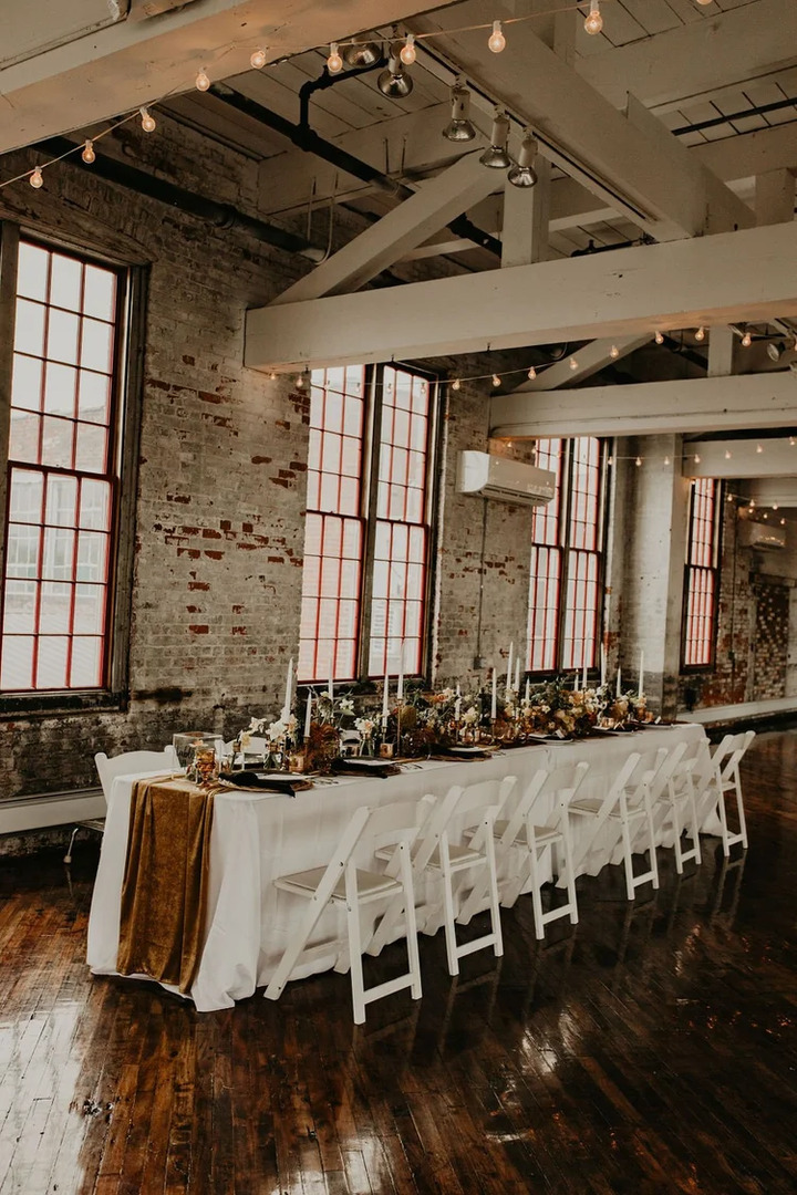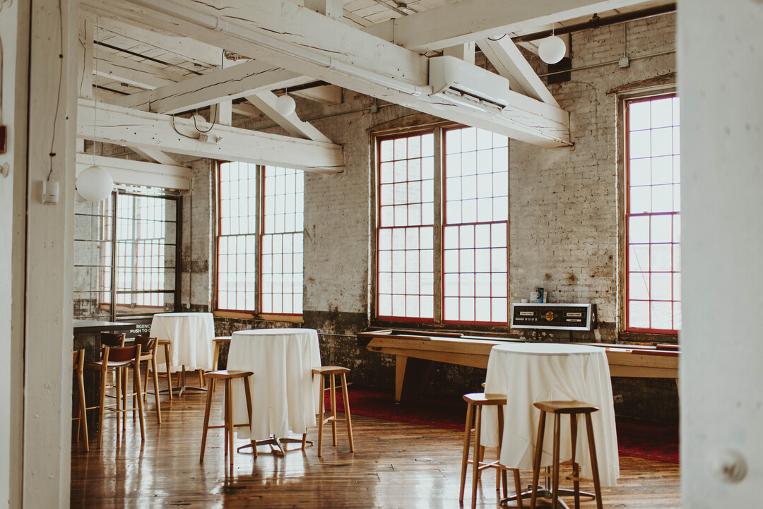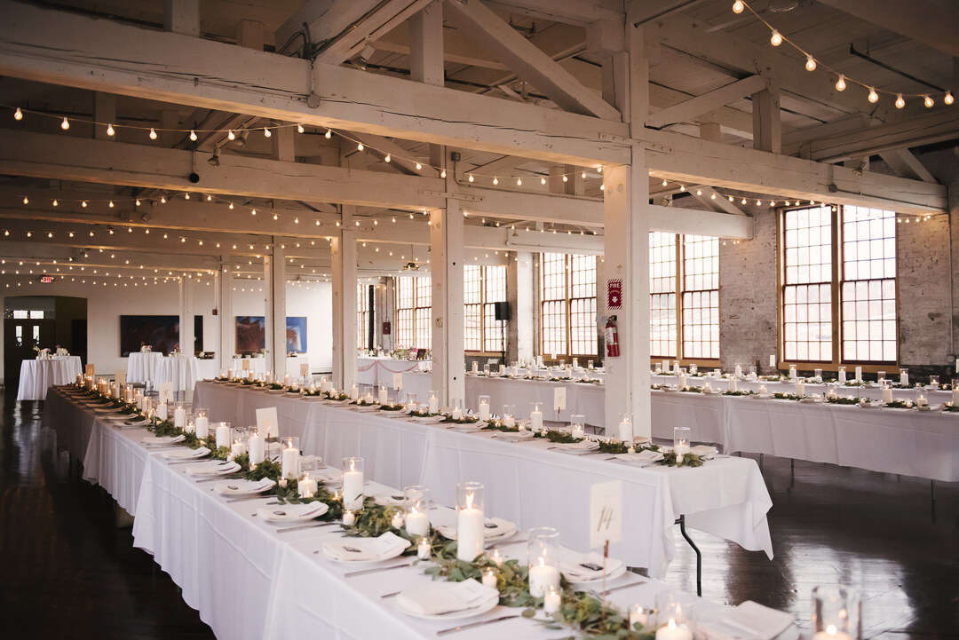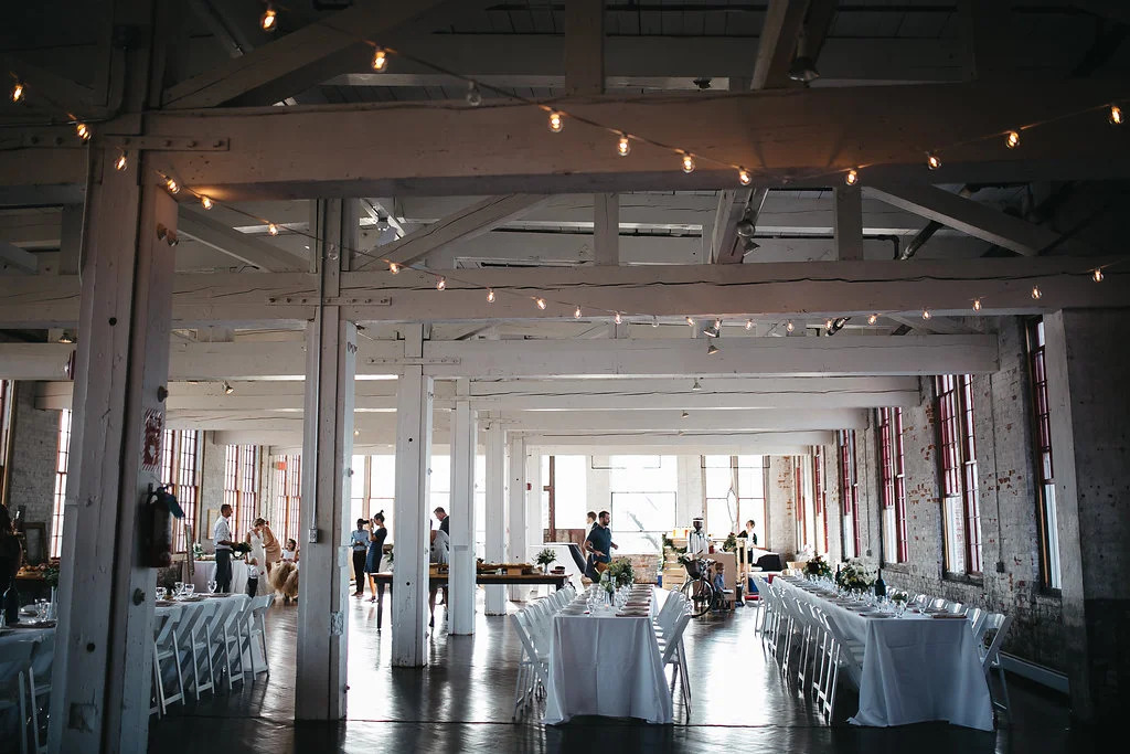 The 6,000 square foot gallery space, located on the second floor of the Cracker Factory is available for wedding ceremonies and receptions. The gallery space has been thoughtfully renovated to bring out the structure’s industrial beauty. A glossy original hardwood floor stages simple yet grand whitewashed columns and overhead wooden trusses. During the daytime, the large factory windows fill the space with lofty natural light and cast sweeping reflections across the floor. At night, an array of small lights illuminate the room with warmth. The space is perfect for events ranging from a small intimate affairs to large parties anytime of the year with climate control and a 376 person capacity. The gallery is supported with a full bar, caterer’s kitchen, handicap accessibility. Please inquire for further information, packages and to arrange a tour.