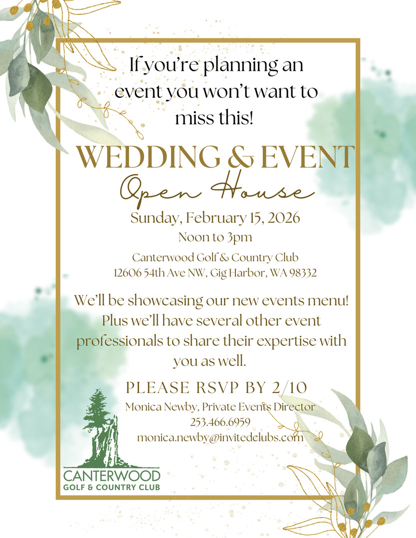 Canterwood provides the ideal spot for hosting your event. The club offers a beautiful selection of full-service private party and event rooms, both indoor and outdoor, which can accommodate up to 250 people. From the smallest, most intimate affairs, to the largest, most extravagant events - regardless of your vision for your event - we can customize the ideal setting to flawlessly complement your plans and goals. Canterwood hosts a variety of events, from business to pleasure - corporate or association meetings, birthdays, anniversaries, galas, weddings, and more - come experience the Canterwood way!