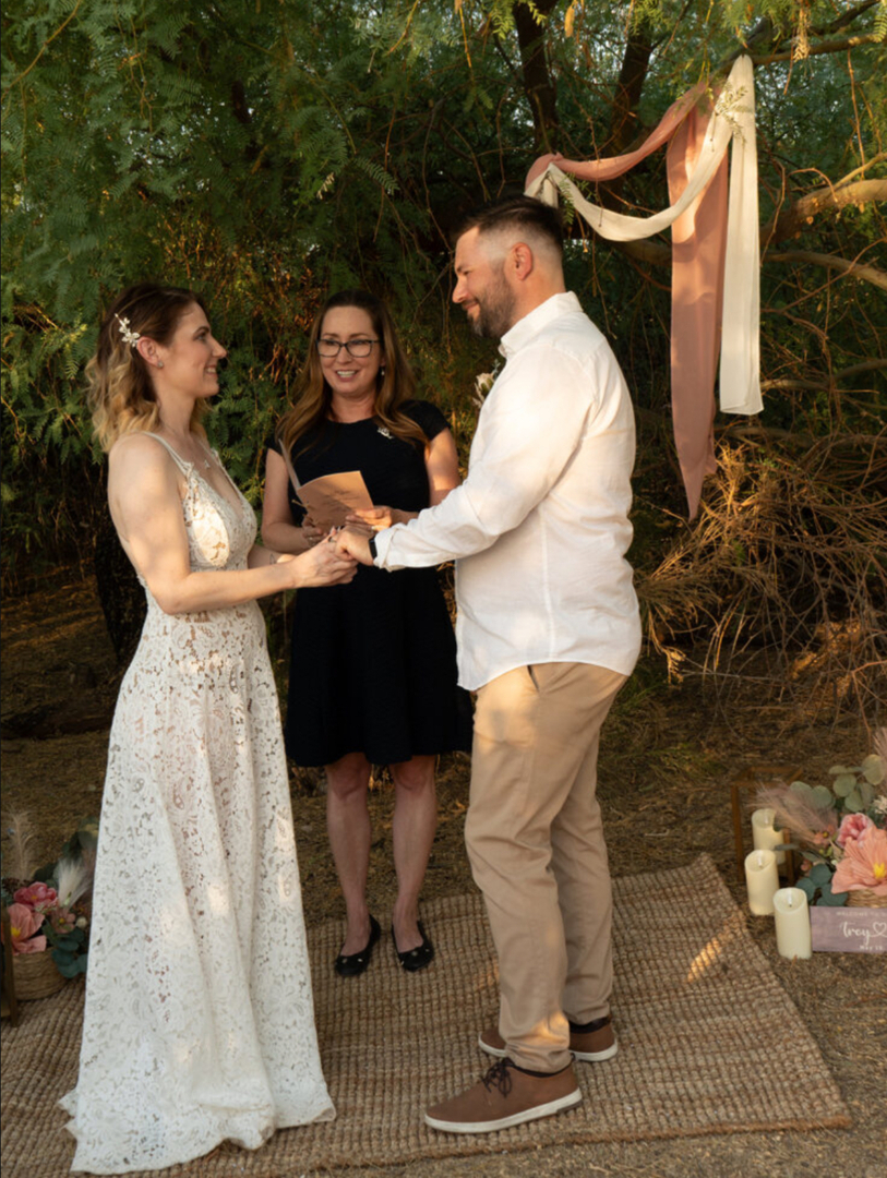 You’re getting married! Congratulations!! I am a teacher by day, but my true calling is joining together two people who love each other. Since I began officiating in 2010, I have very proudly officiated hundreds of beautiful and unique wedding and vow renewal ceremonies. I will gladly travel to your site in the metro Phoenix area to officiate your wedding. Popular locations I have officiated include gardens, waterfront, roof-decks, restaurants, hotels/resorts, lofts, private homes, public parks, and reception halls. I would be happy to customize your wedding vows for you, or you may use your own. You may want a small, intimate wedding or elopement, or a grand celebration; You may wish to integrate a prayer and blessing or have no religious tones at all. I am excited to hear what you have in mind. My honorarium ranges between $125-$200, depending on location. This fee includes unlimited phone and email correspondence, personalized wedding vows, the punctual performance of your marriage ceremony, and the prompt and proper filing of your marriage license. For a rehearsal, there will be an additional $50 fee. I can be flexible on pricing, depending on location.
