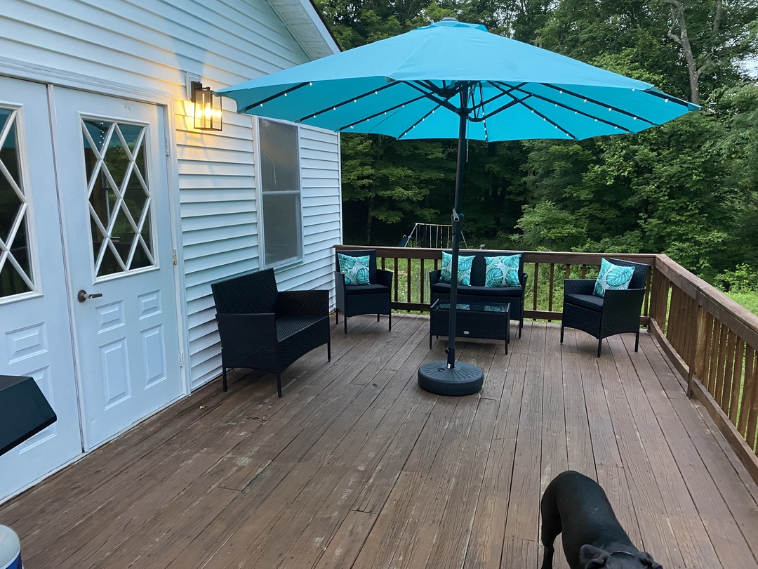• Special Features: Fully functioning kitchen with gas stove and refrigerator. Large tables available for rent for your event. There is an adjoining deck for your guests to enjoy the refreshing mountain air. Listen to the nearby babbling creek and enjoy view.