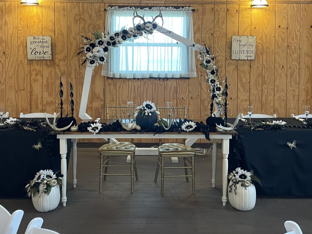 Venue rental includes a cozy temperature controlled dinner/party room, tables and chairs for up to 200 guests, serving tables, prep room with refrigerator and freezer, accessible restrooms, an outdoor patio, Bride's dressing cottage and a Groom's dressing cabin.
