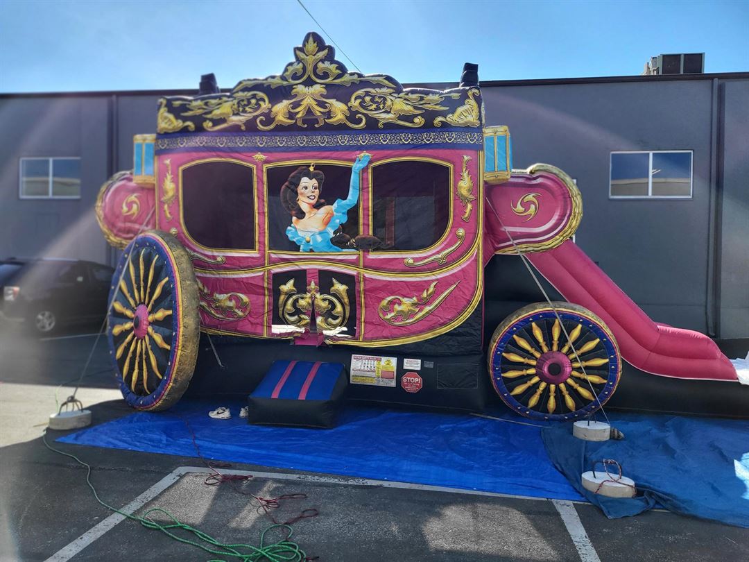 Clean and affordable inflatable for rent! We have a Princess Carriage Combo bounce house that will be sure to add magic to your little girl's birthday party! We include a sparkly tiara with the rental of every princess carriage to go with the princess theme!