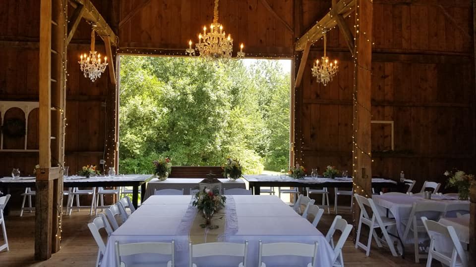 Out at the Vintage Rose Barn, one can enjoy all of the beauty mother nature has to offer and the charm of the countryside while still being easily accessible no matter what direction one is coming from. Whether it's in the bloom of the spring with blossoms of 120 year old lilacs and daffodils to summer when the trees are a lush green with night skies filled with twinkling fireflies and falling stars, or in the fall when the colors burst into an enchanting sight. This peaceful 5 acre property is filled with beauty. There are 200-300 year trees that fill the property with beauty; one is wired to hold three chandeliers to light for a romantic day/evening.