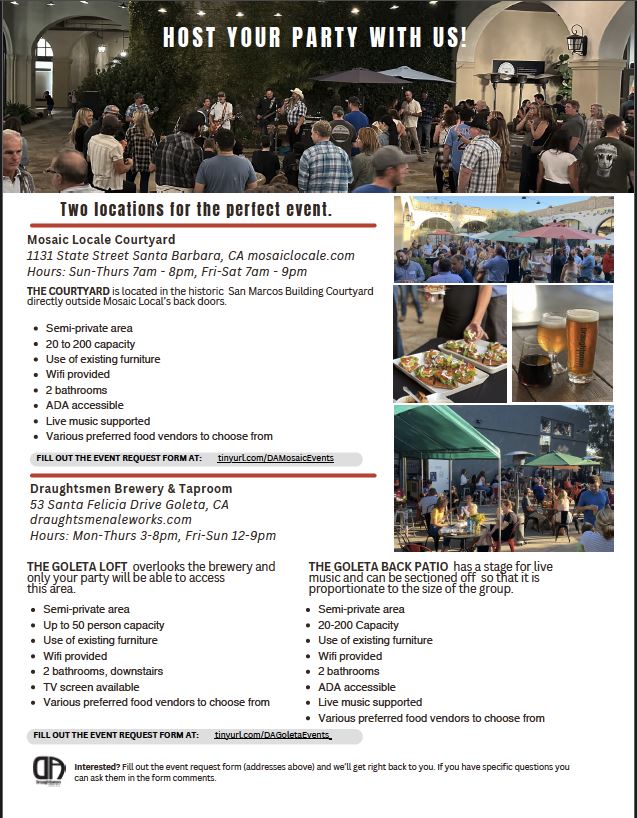 Draughtsmen Brewery and Taproom: tinyurl.com/DAGoletaEvents