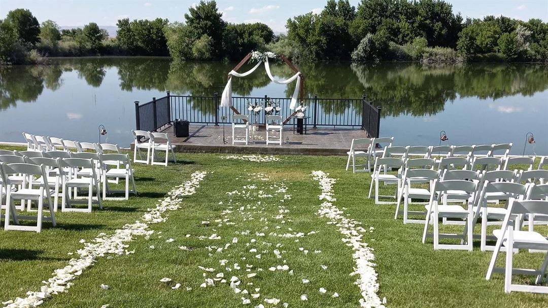 Our event center sits on a beautiful lake with a beautiful manicured lawn and lots of beautiful flowers everywhere. This is an outdoor facility with a huge party tent, sitting on a concrete floor, that will seat 160 people for a sit down menu with lots of room outside the tent and in front of the lake. The wedding party can all stand on a big 12'x20' deck that sits out over the water. Great photo opportunities all around the venue. We have dressing rooms for Brides, Bridesmaid's and Groom and Groomsmen. We have WiFi available on site. We have refrigerator and freezer space available and trash removal is provided.