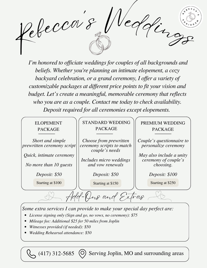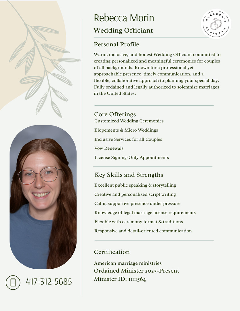 Hi, I’m Rebecca—an ordained wedding officiant who believes your ceremony should feel just as meaningful and personal as the commitment you’re making. I first became ordained to officiate my cousin’s wedding, and I never expected how deeply that experience would stay with me. Standing beside two people I love, helping them speak their promises, and feeling the emotion of that moment was incredibly special. I walked away knowing I wanted to keep creating that feeling—not just once, but for as many couples as I could. What began as a one-time favor quickly became something I turned into a career I truly love.