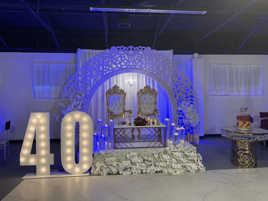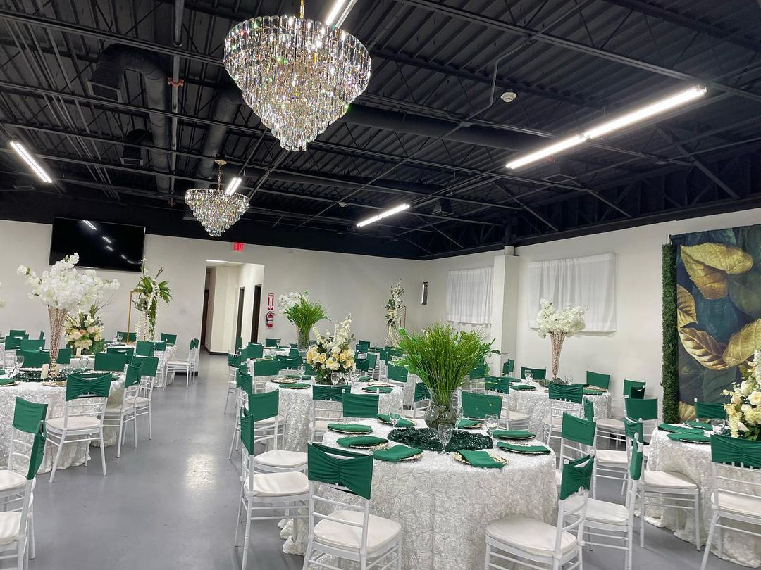 Features: Beautiful Chandeliers, Bar, Deep Freezer- BYOB; Kitchenette; Microwave, Oven and Fridge/ Freezer; White Dance Floor; Stage; Lobby with Flower Wall, Changing Rooms