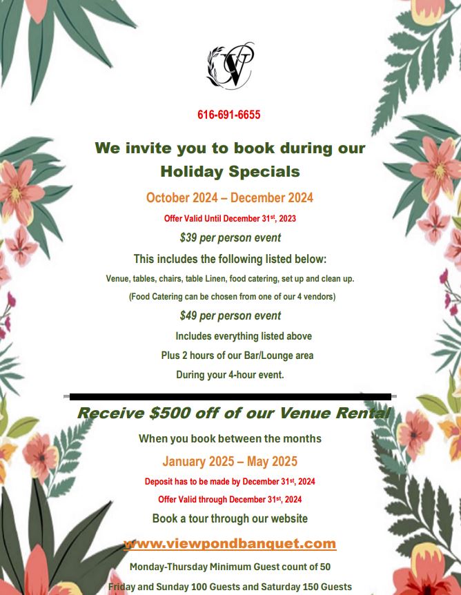 Viewpond Banquet Hall has been involved in some of the most beautiful celebrations in Grand rapids. Our unique venue offers everything needed to create your perfect event. We always make sure to provide our guests (up to 220) with the best services, offering a wide variety of customizable menu and design options.