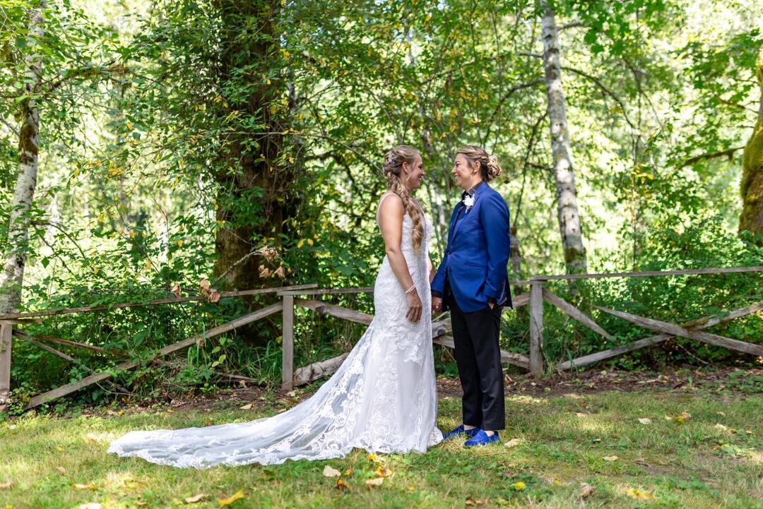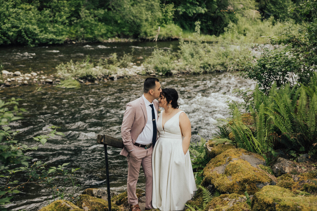 Ceremony area is riverfront and crowned by a beautiful cedar log arch, with a winding river-rock pathway