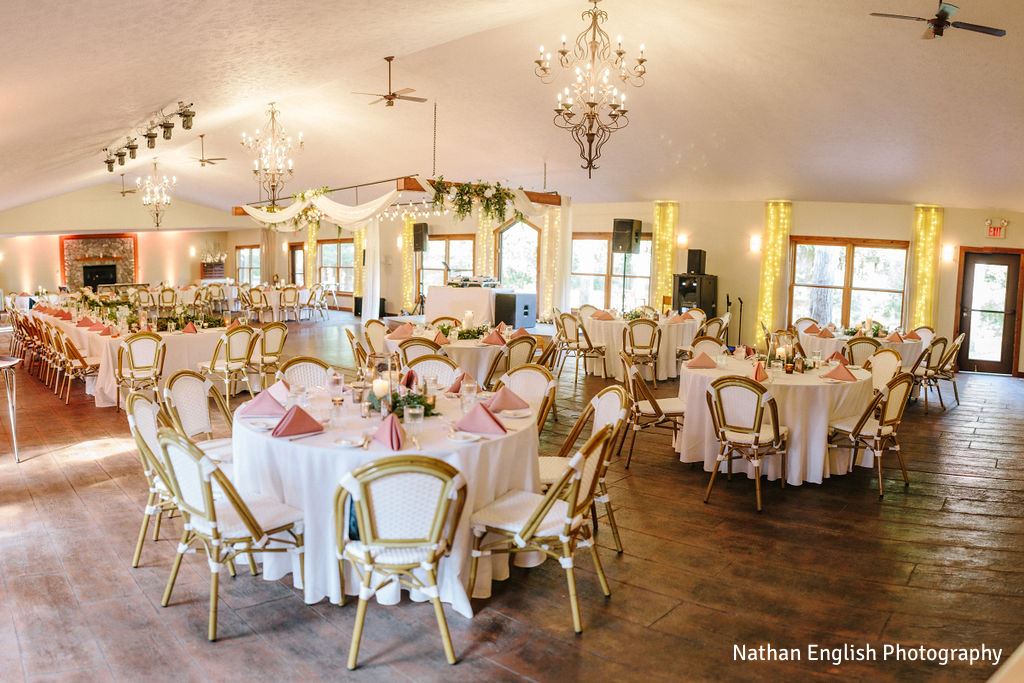 Nestled by stunning, mature hard woods and pines, BlueBridge’s exterior is beautifully landscaped with gardens, walking paths, small ponds with fountains and small bridges, several outdoor fire pits, and countless special touches. There are no shortages for great photo opportunities that will serve as the perfect backdrop for capturing your special day. Our desire at BlueBridge is to partner with you so your day is everything you dreamed it would be while at the same time making it worry free. We accomplish this by providing an absolutely beautiful, peaceful environment where everything you need is convenient and right at your fingertips. In addition to the unique spaces, we provide flowers, decorations, DJs/Music, and beverages.