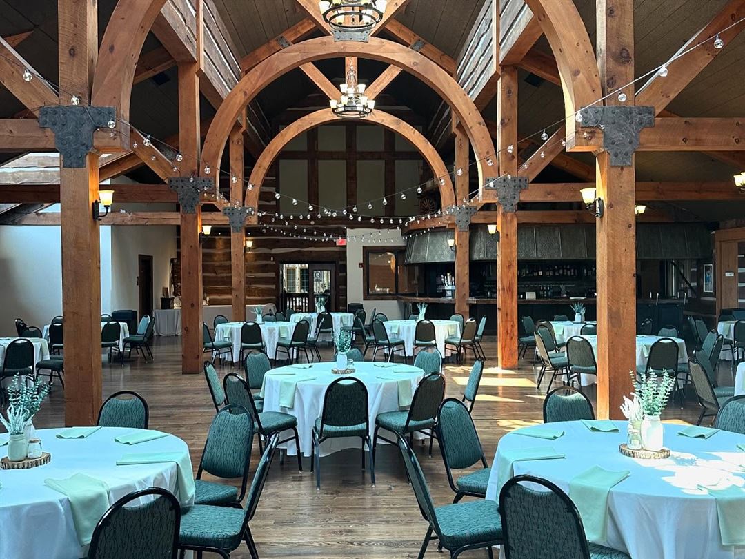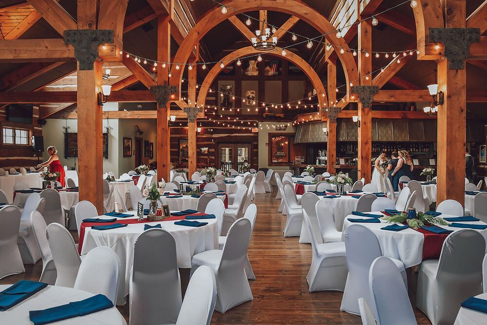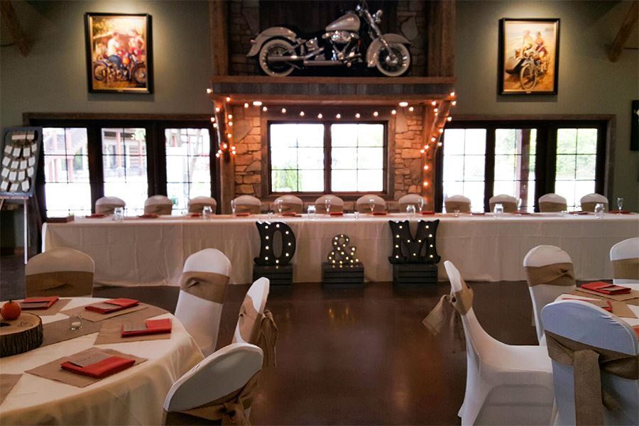 Olde 41 is located upstairs of Vandervest Harley-Davidson Dealership. Beautifully rustic wood beamed reception room, with outdoor patio area that overlooks our ceremony site and Duck Creek, as well as a Mezzanine overlooking the dealership show room floor, another unique feature. Overlooking Duck Creek is “The Duck Blind”. The building has log siding and a wrap-around porch overlooking the creek. The antique fireplace is one of a kind and creates a unique ceremony/photo site . This is an open concept venue that has very rustic décor with barn beams, barn boards, galvanized metal finishing’s and antiques which showcases the facility.