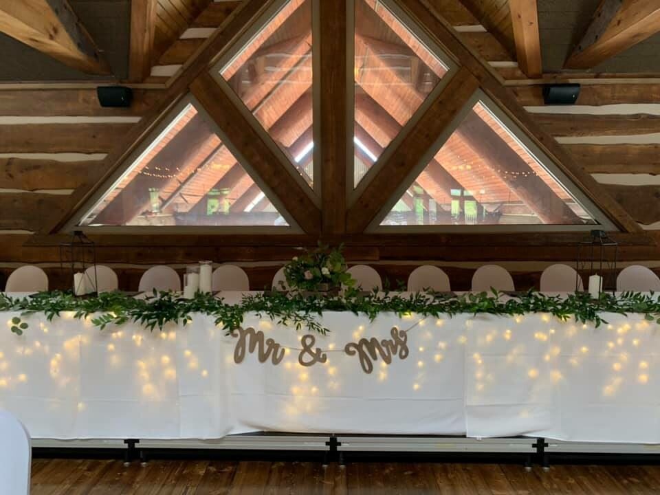 The black granite bar with barn board décor is elegant and rustic. The outdoor flower beds and large art sculpture are beautiful photo areas. Indoor ceremonies are available for in-climate weather/winter weddings. We also have a beautifully landscaped outdoor ceremony site featuring rustic, one of a kind arch, up to 150 white chairs, overlooking Duck Creek. It is placed conveniently between both the Olde 41 and Duck Blind Facility.