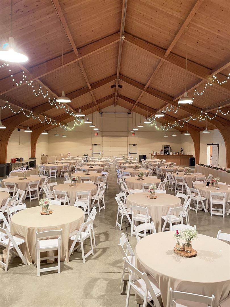 The wedding pavilion offers a rustic setting for a wedding reception with outdoor entertainment. The structure features overhead doors that can bring in or keep out the weather. The spacious, unobstructed interior is well suited to accommodate small, large, casual, or formal gatherings.