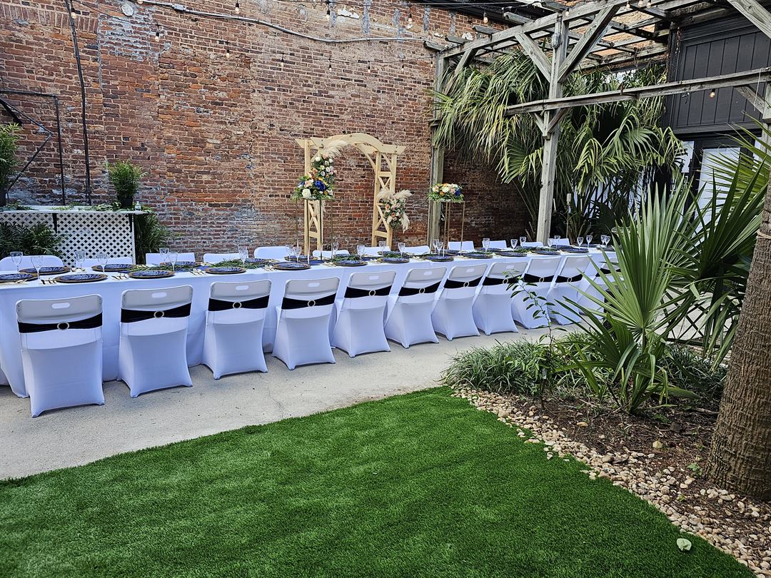 The gorgeous Palm Garden and Courtyard is filled with plants native to Georgia, including lush palms, black bamboo, and much more. The spacious patio features an old brick backdrop and is adorned with Edison lights, giving the space a cozy, welcoming feel. The soft sound of the fountain will relax your guests as you celebrate your upcoming wedding together. You can keep your decorations minimal in this unique setting, as its natural beauty is enough. As well as the garden, this venue offers the 400 sq. ft Statham Room, an indoor room with easy access to the garden, and the 900 sq. ft Gathering Room. The Statham Room accommodates up to 36 seated guests, or this room can house catering and provide additional seating for larger events. Simple but stylish, it's the perfect blank canvas for celebrations of all kinds. The Gathering Room seats 100 guests or 70 guests and room for a dance floor and DJ. It too is simple, but stylishly decorated.