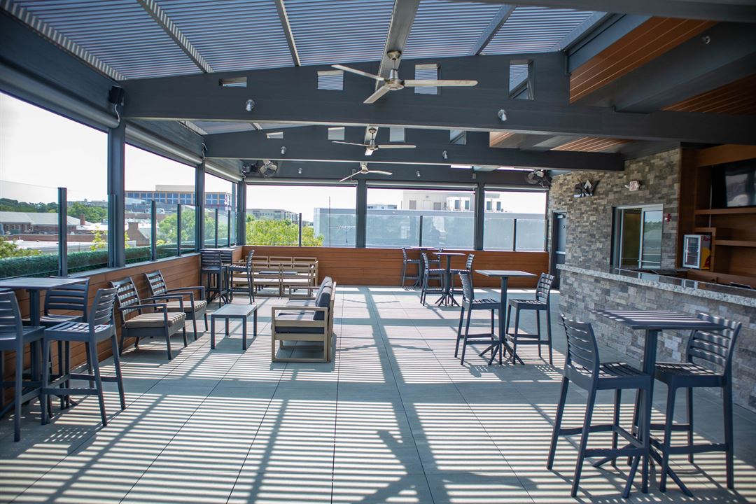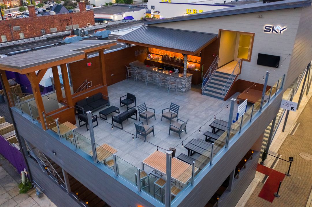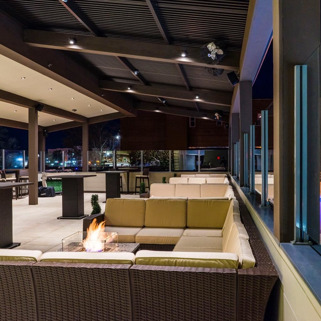 As you make your way upstairs to the rooftop, you will enter Sky Bar. It features comfort seating, high tops, 2, and an area designated for live music. Sky Bar also features a roof and blind enclosure system that opens and closes to transform Sky from open air to a closed environment instantly.
