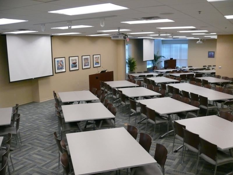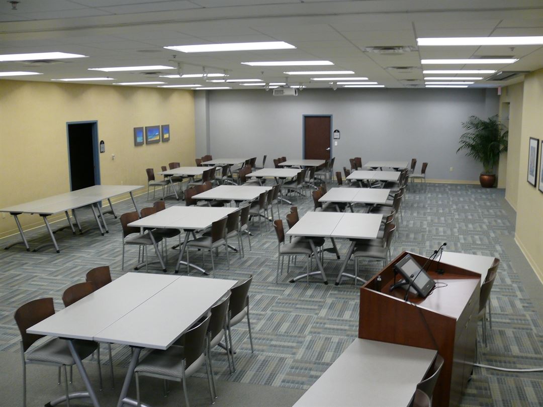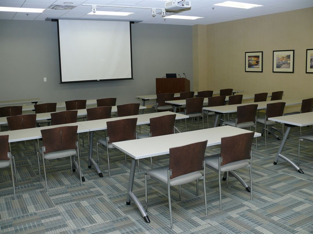 Multi-use Meeting Spaces A and B. Combined these two spaces provide the largest space available in the facility, approximately 100 people in a classroom setting with tables and chairs. When combined the presentation system will consist of: