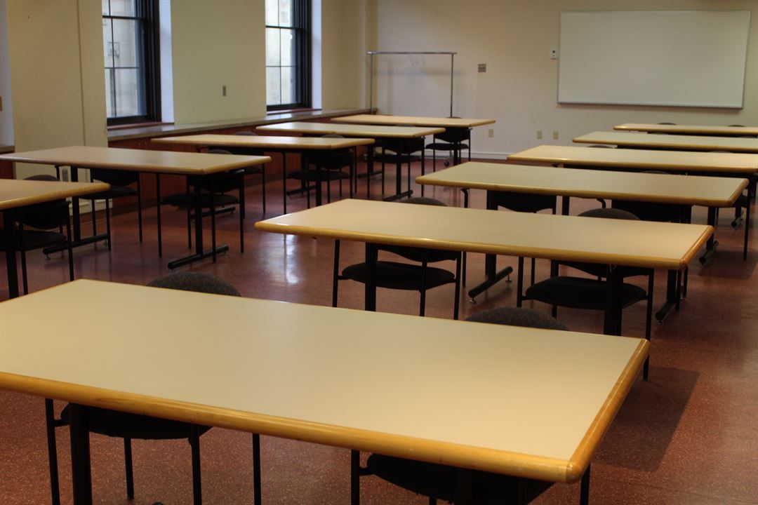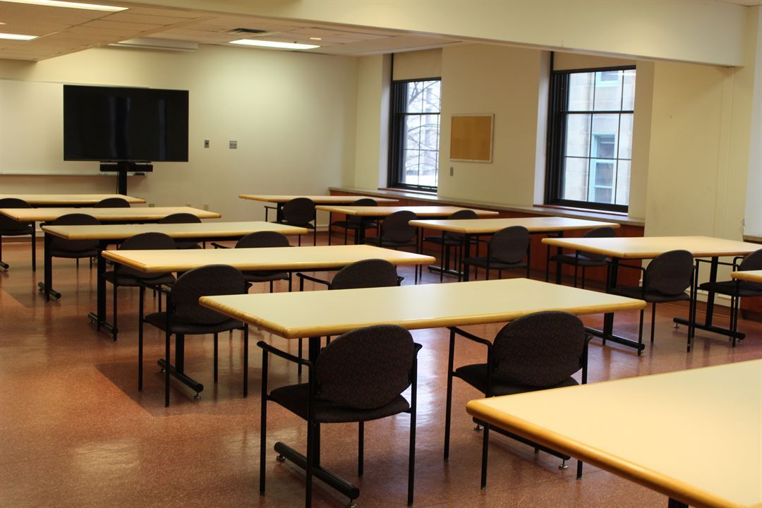 AV solutions include podium, portable speakers, wired mic, 70" digital display, Polycom webconferencing hardware, hardwired internet, and teleconferencing.
