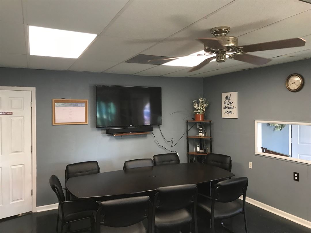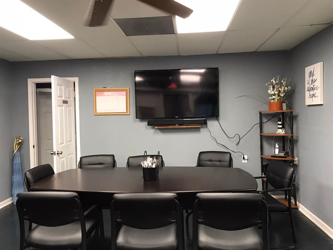 Our conference room is perfect for small groups, business meetings and clubs. Our conference table can accommodate eight people comfortably. We can also add tables and chairs for larger groups. We offer a 62" monitor with sound and easy HDMI connection for presentations and video conferencing.