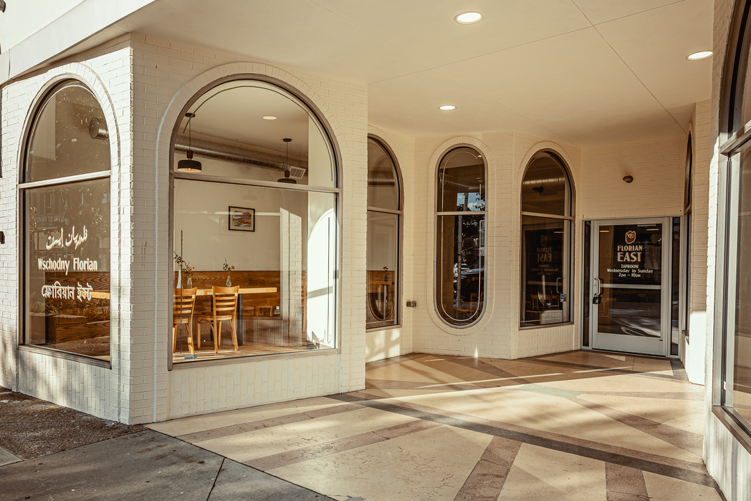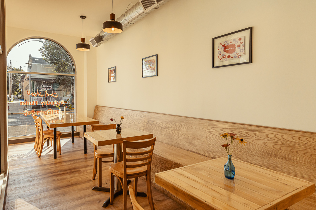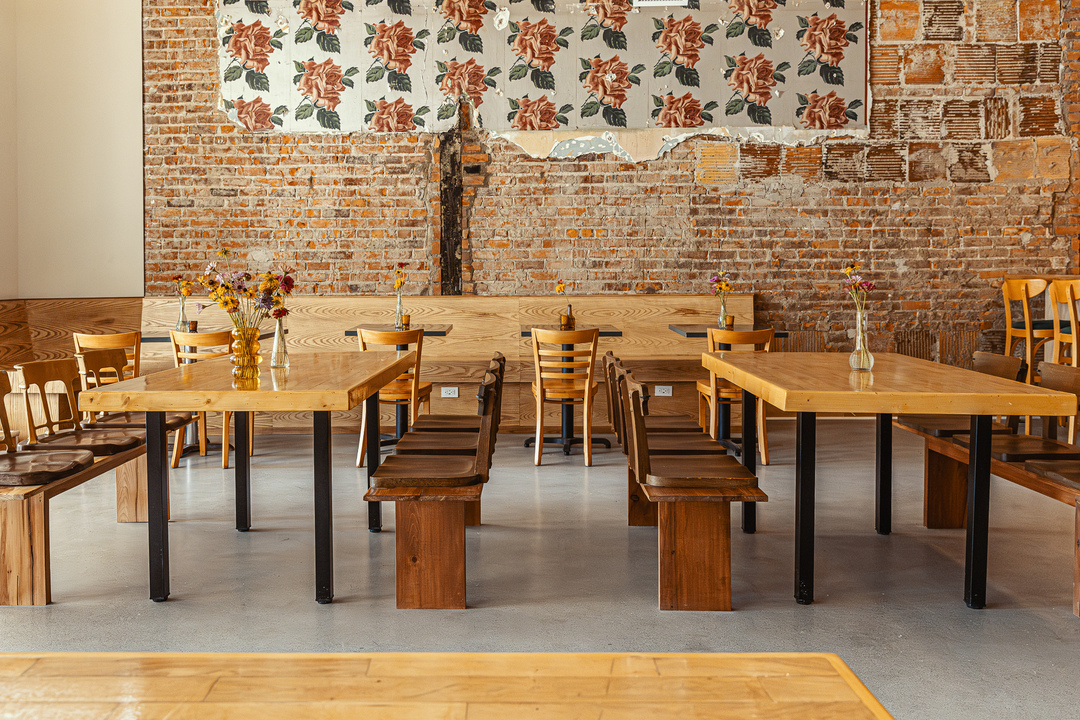 After entering through a beautiful, terrazzo-clad covered entryway, the large taproom/bar area opens up to a well-appointed interior featuring brick walls with patches of antique painted rose wall paper. Comfortable seating arrangements are available for 50+ people at a stunning ash wood bar, custom-made salvaged-wood tables, and intimate seating areas located within two converted display cases. Meanwhile, unique, arched windows make for natural light-flooded afternoons.