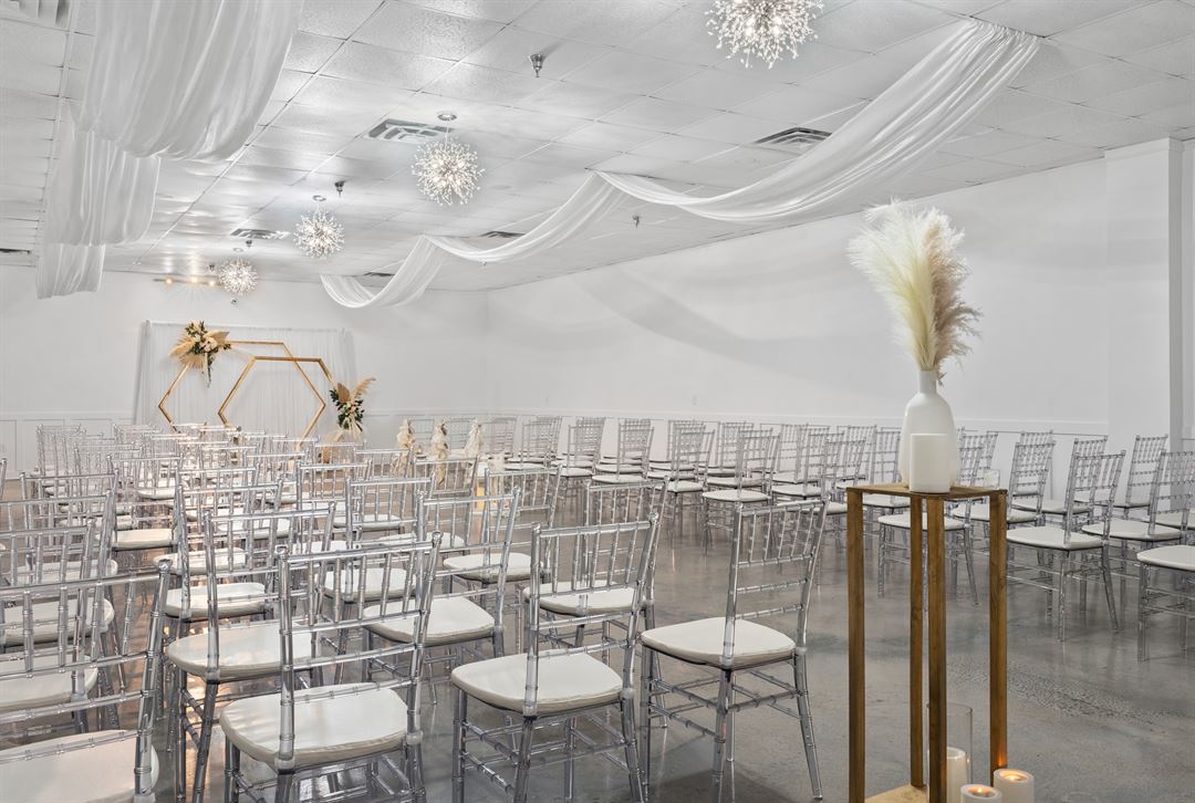 Our venue features high ceilings, sparkling chandeliers, draped ceilings, and a modern, timeless aesthetic that can be tailored to any event style. We offer full-service event planning, catering, and decor to ensure a seamless experience from start to finish. Whether you're hosting an intimate gathering or a grand celebration, our experienced team is dedicated to bringing your vision to life.