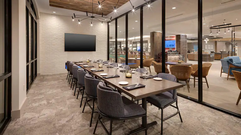 Our private dining room at Red House Tavern offers an intimate and inviting atmosphere, perfect for gatherings, celebrations, and corporate dinners. The glass enclosed room offers an abundance of natural lighting, cozy fireplace and TV monitor with HDMI capabilities, while dimmable lighting allows you to set the perfect mood for your event.