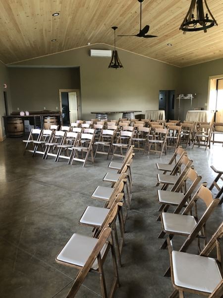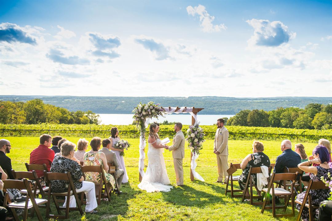 The event pavilion at Flatt Rock Wine Cellars provides a covered seating area for up to 150 guests. The open-air space features rustic ceiling lighting, natural wood details, and an eclectic bar area. The property has a picturesque view of Seneca Lake and the lush vineyards as a natural backdrop for couples to say their vows. Clients and their entourage will have access to the dressing room complete with modern amenities to prepare themselves before they head to the altar. In addition, a large kitchen area is available for your catering party to prepare their mouth-watering cuisines for the reception and cocktail hour. The tasting room on-site creates an intimate setting to decide your favorite sips and flavor notes, as a relaxing adventure before the big celebration. The location has a large parking lot on the property, with wheelchair accessibility to ensure anyone can enjoy the special day.