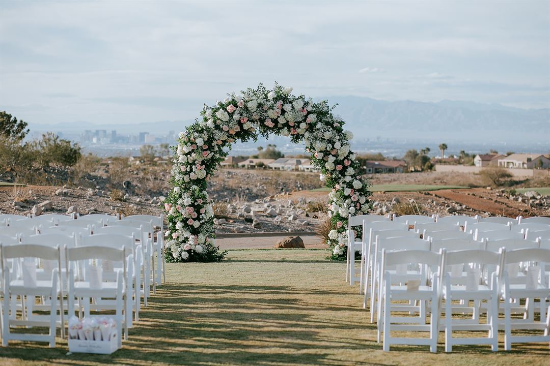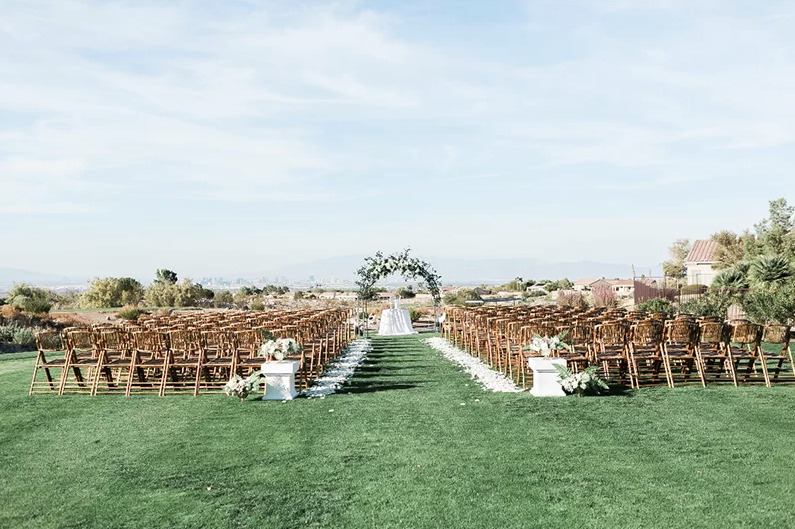 The Revere Golf Club provides an all-inclusive Las Vegas wedding experience from the venue to catering to florists and photography, we can handle every detail of your special day. Offering four unique ceremony sites, three outdoors and one indoor site, with space enough to host up to 350 of your guests. The outdoor sites each highlight a feature of the Club from the rolling hills of the championship golf course to lake views to panoramic views of the famous Las Vegas skyline. Following your ceremony, your guests will be treated to a gourmet dining experience at our Clubhouse which maintains that unending view to the Las Vegas skyline. The Clubhouse features accommodations for up to 200 guests at one of three banquet spaces or host up to 350 friends and family on our vast lawn for an al fresco event.