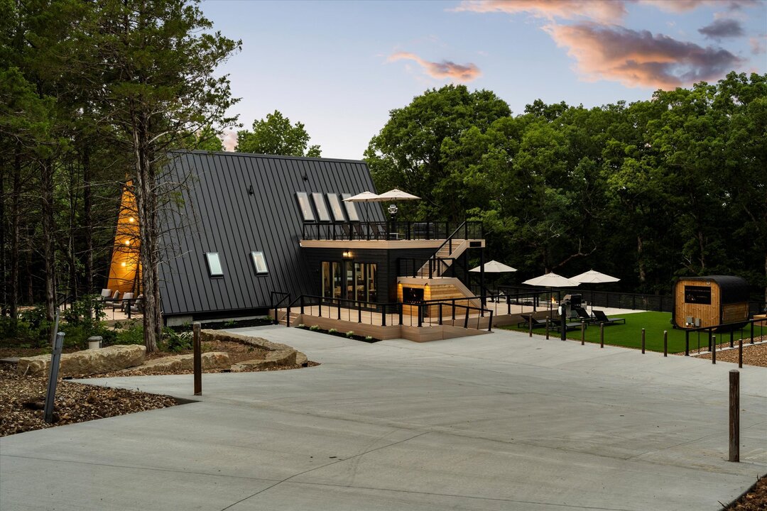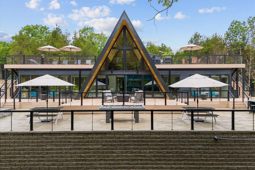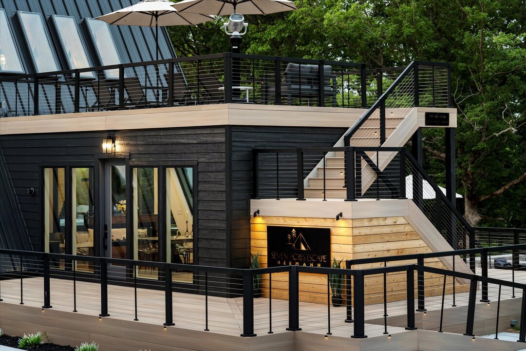 Seven Acres Escape is more than just a home — it’s a fully immersive retreat. Located just 15 minutes from historic Hermann, Missouri’s beloved winery and distillery town, this architectural A-frame was crafted by local artisans with wraparound decks, rooftop terraces, and outdoor spaces designed for wellness, play, and connection.