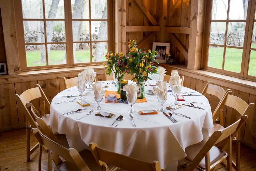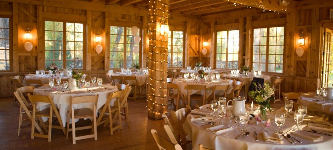 Receptions take place in our charming two-story barn, complemented by a 40 x 60-foot high-peak white tent, expansive flagstone patios, and covered portals. The Ridgewood’s stone and pine architecture features tall windows that frame panoramic views of snow-capped mountains, lush meadows, tranquil ponds, flowing streams, and towering 100-year-old cottonwoods.