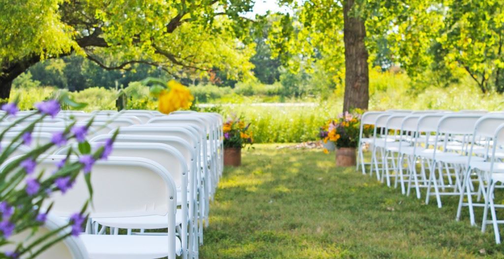 Outdoor Ceremonies: choose between several locations overlooking the lake or the more private amphitheater for your prairie garden ceremony. White chairs available to rent for outdoor use.