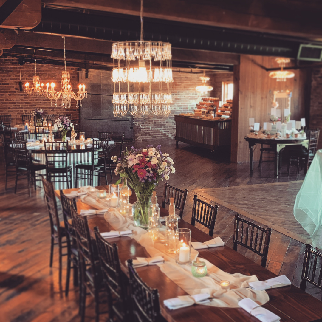 Our 1870’s warehouse is on the new Hickory City Walk in the heart of downtown, within walking distance of local breweries, shopping and eateries. The industrial charm of the vintage brick and original wood are offset by the elegance of the crystal chandeliers and unique finished wood tables with chiavari chairs. The venue features two separate five thousand square foot spaces where you can host both your wedding ceremony and reception, or choose just one space for a fantastic reception, party or business meeting.