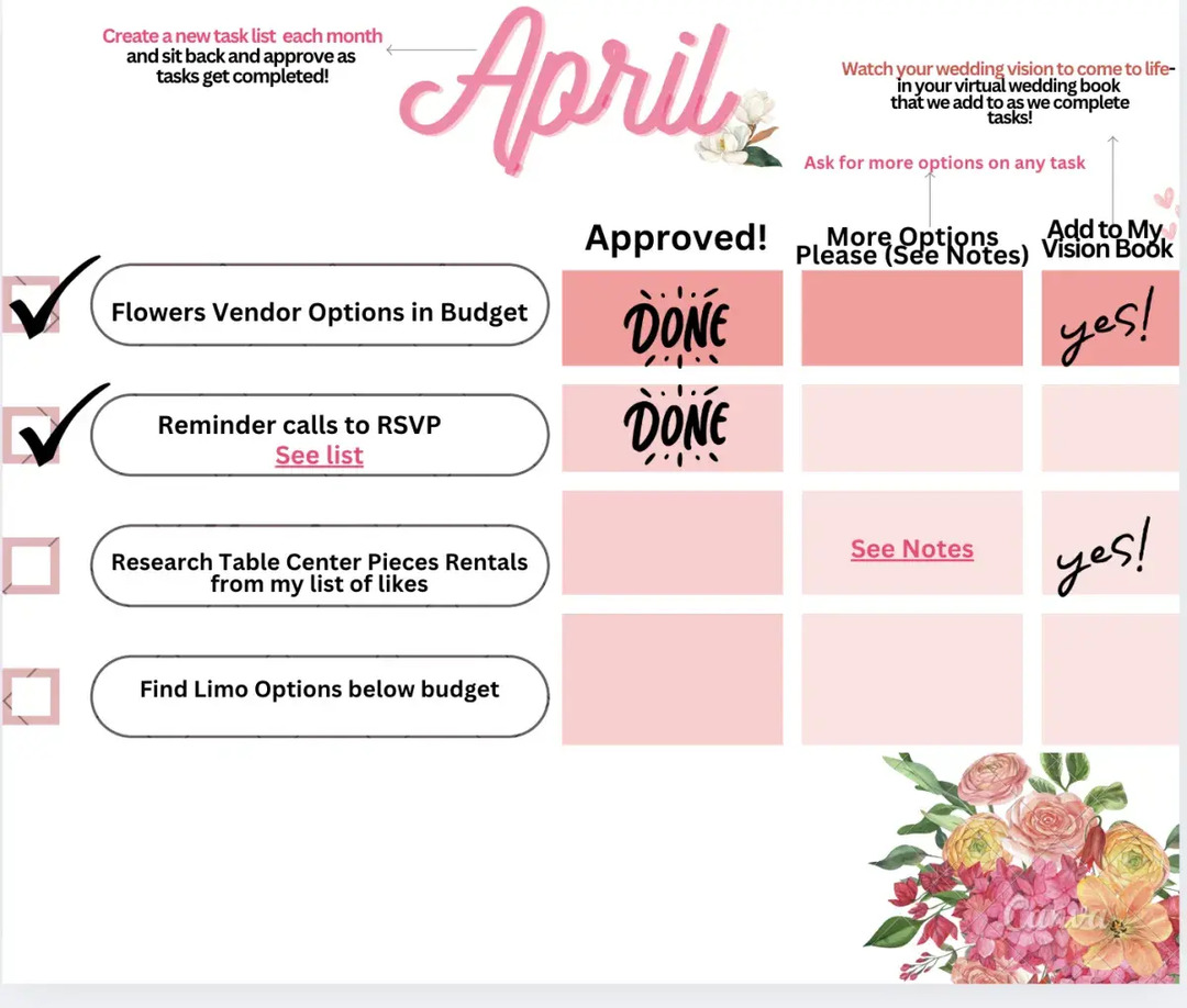 MyWeddingVA is a premier Wedding Virtual Assistant Team that specializes in helping you have a stress free journey to your wedding by helping with your task list! Our expert wedding assistants help complete your to do lists quickly and efficiently through a virtual planner. We're an affordable option to a Wedding Planner, with the same personal attention as we assign each bride their own dedicated wedding virtual assistant who will get to know your likes and dislikes to work on your tasks efficiently, while updating your own virtual wedding visual book along the way so that you can watch your wedding vision grow.