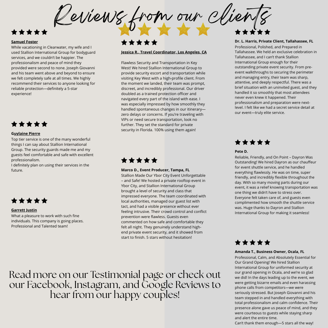 Stallion International Group provides elite security solutions for weddings, private events, corporate functions, and VIP gatherings across Florida. Our highly trained officers specialize in guest list enforcement, crowd management, VIP protection, and discreet event security to ensure your celebration runs flawlessly. From intimate ceremonies to large-scale galas, Stallion International Group delivers peace of mind with a professional, luxury-level presence that sets us apart from ordinary guard services.
