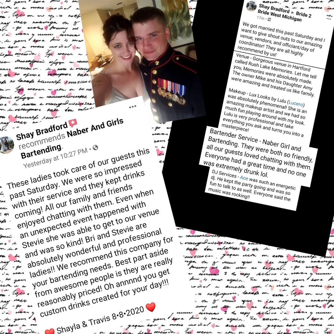 we would be honored to help you celebrate. We provide two MI TIPs certified (licensed) & Insured Bartenders with 20+ years experience for one low price. Traveling throughout Michigan we provide service in any location, inside or outside we have you covered. From helping you put together a budget friendly shopping list to creating one of a kind signature drinks, we take pride in providing you with the best service. Please message me so that we can discuss the best bar service for you.