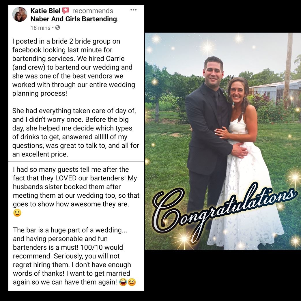We would be honored to help you celebrate. At Naber & Girls Bartending LLC you are not just a part time gig; YOU ARE OUR FULL TIME COMMITMENT !!