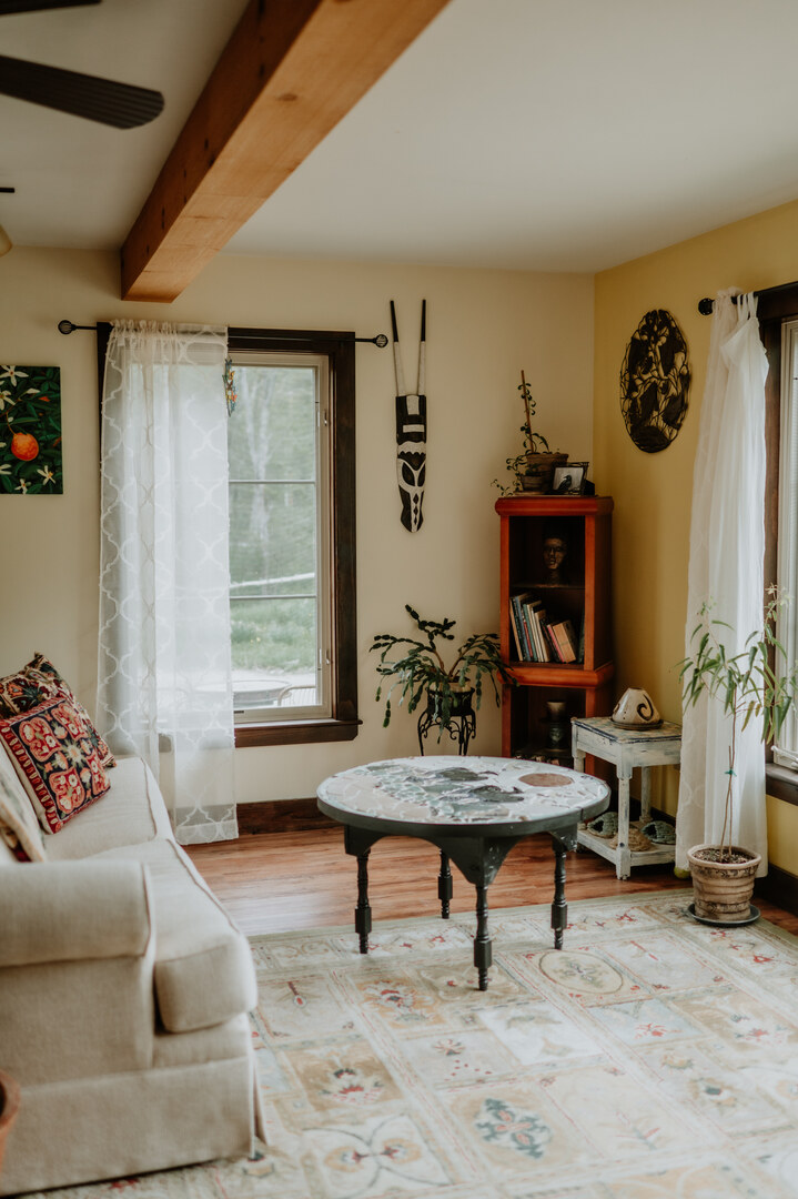 Gardens, trails, mosaic patio, fire pit, art, pond and seclusion. Organic vegetable gardens are available for fresh herbs and vegetables. 20x40 tent on site