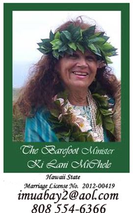 Romantic, Spiritual, Personal, Non-Denominational Hawaiian Style Ceremonies for a $250 tax-deductible donation to an Alternative Cancer Treatment foundation. The ceremonies open with the sound of the conch and close with "The Hawaiian Wedding Song" and "Hawaii Aloha" sung and played on ukulele.